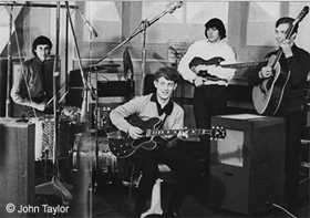 Os Mavericks gravando um dos compactos Noddy no centro, com uma Gibson 335